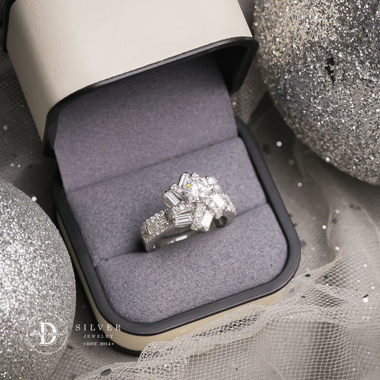 Nhẫn Bạc 950 Đá Moissanite 6li Ổ Hoa Xoáy Đính Baguette - Snowflake Flower Moissanite Diamond Silver Ring