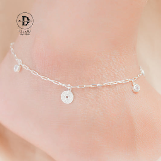 Lắc Chân 3 Lucky Coins & 2 White Stones - 3 Đồng Xu May Mắn Silver Anklet - 507LCH