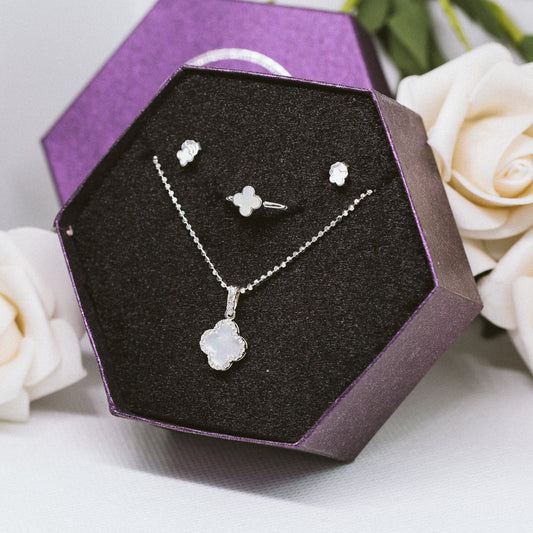 Bộ Trang Sức Bạc Cao Cấp 925 🍀 Bộ Cỏ 4 Lá Màu Trắng