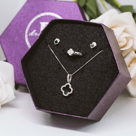 Bộ Trang Sức Bạc Cao Cấp 925 - Bộ Cỏ 4 Lá Màu Đen