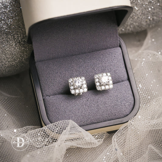 Bông Tai Bạc 950 Đá Moissanite Halo Vuông - Đá Chủ 5li - Square Halo Moissanite Premium Silver Earrings