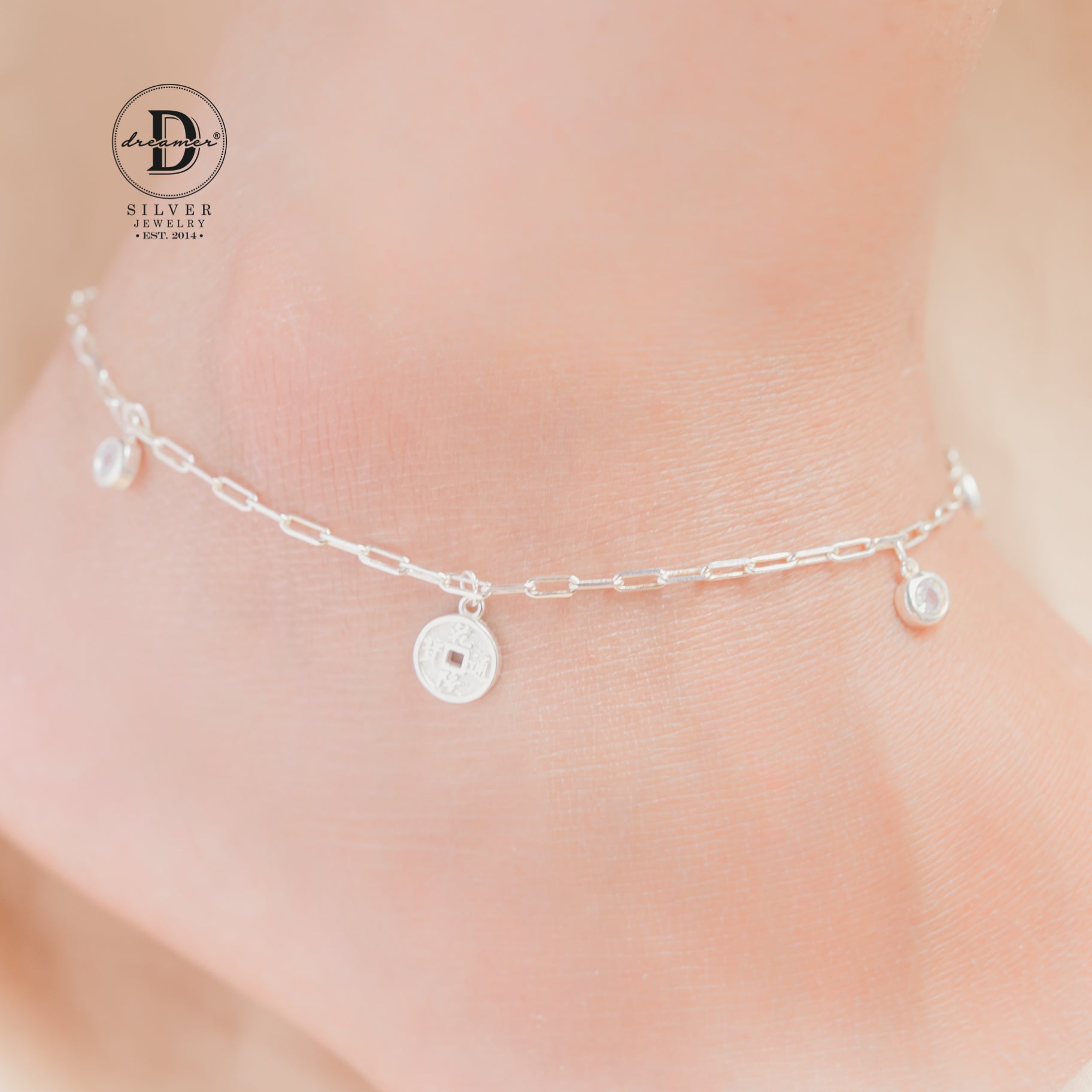 Lắc Chân 3 Lucky Coins & 2 White Stones - 3 Đồng Xu May Mắn Silver Anklet - 507LCH